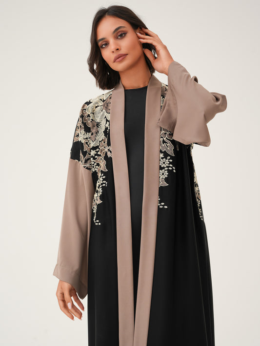 Black and beige contrast Abaya and exquisite Floral Embroidery on the shoulder